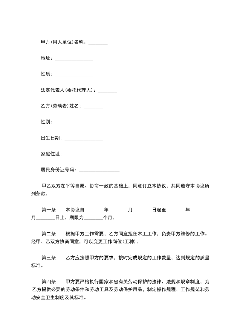 第二条 根据甲方工作需要,乙方同意担任木工工作,负责甲方维修的工作。经甲、乙双方协商同意,可以变更工作岗位(工种)。