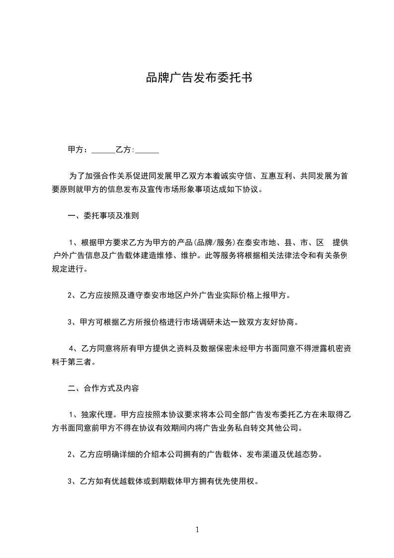 1、根据甲方要求乙方为甲方的产品(品牌/服务)在泰安市地、县、市、区 提供户外广告信息及广告载体建造维修、维护。此等服务将根据相关法律法令和有关条例规定进行。