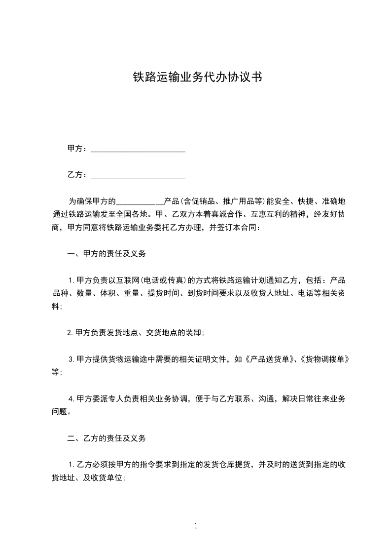 为确保甲方的____________产品(含促销品、推广用品等)能安全、快捷、准确地通过铁路运输发至全国各地。甲、乙双方本着真诚合作、互惠互利的精神,经友好协商,甲方同意将铁路运输业务委托乙方办理,并签订本合同: