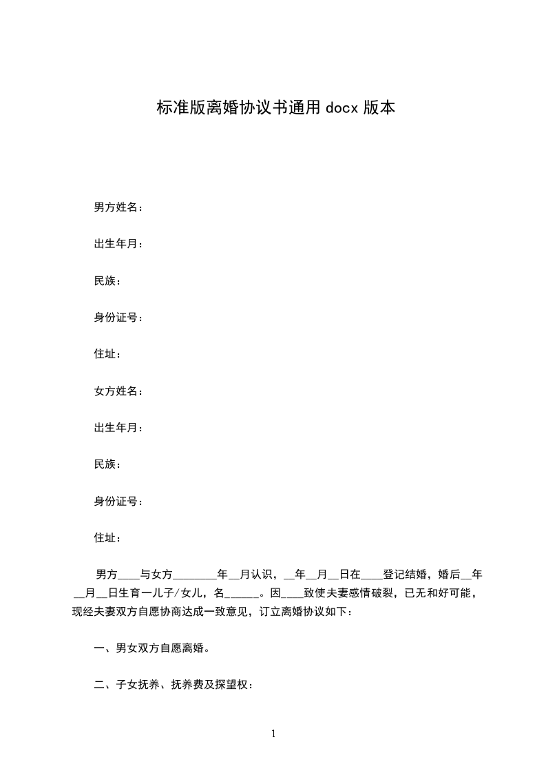 男方:____ ,________年____月____日出生,民族____,工作单位:________________ ,现住址:________________________ 。
