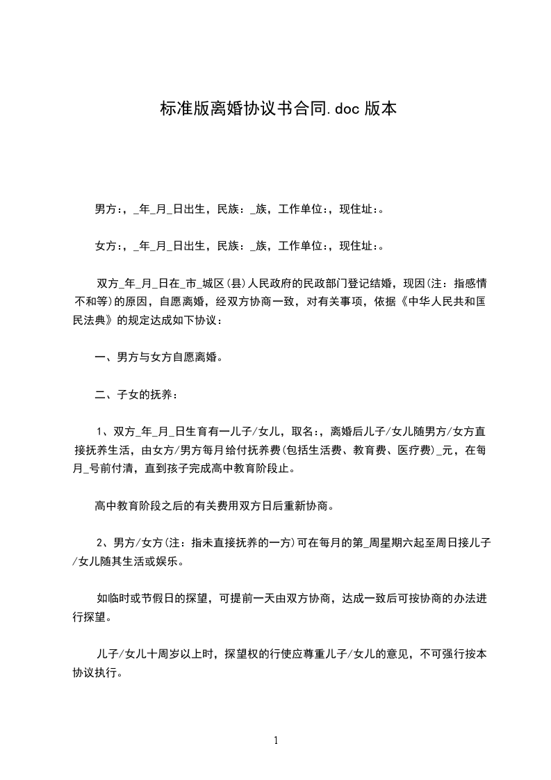 女方:____ ,________年____月____日出生,民族:____,工作单位:________________ ,现住址:____________________ 。