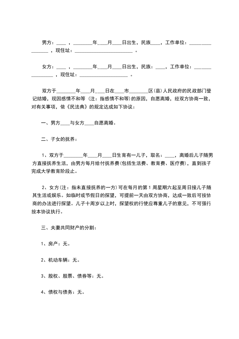 双方于________年____月____日在____市________区(县)人民政府的民政部门登记结婚,现因感情不和等 (注:指感情不和等)的原因,自愿离婚,经双方协商一致,对有关事项,依《民法典》的规定达成如下协议:
