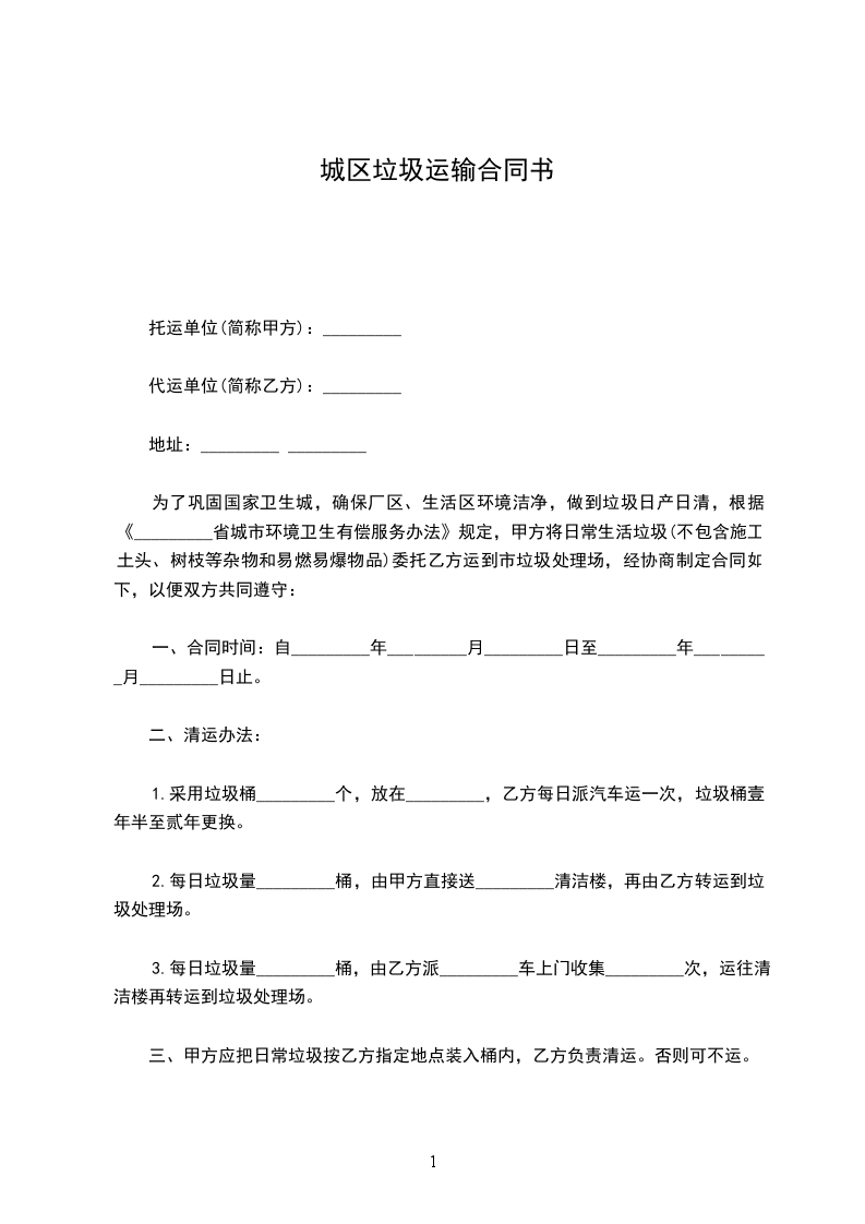 为了巩固国家卫生城,确保厂区、生活区环境洁净,做到垃圾日产日清,根据《_________省城市环境卫生有偿服务办法》规定,甲方将日常生活垃圾(不包含施工土头、树枝等杂物和易燃易爆物品)委托乙方运到市垃圾处理场,经协商制定合同如下,以便双方共同遵守: