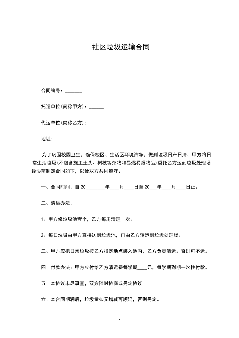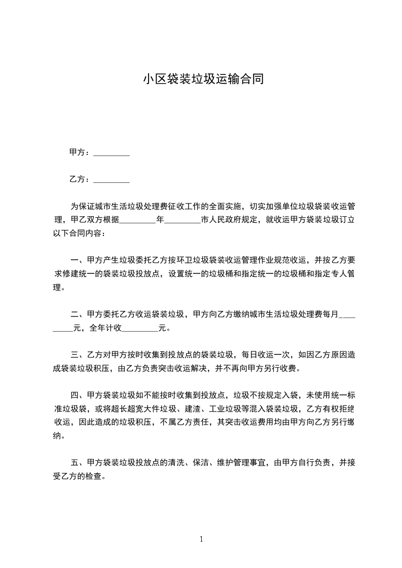 五、甲方应按期交纳费用,超期交款乙方增收滞纳金_________%或停止清运。乙方如没按时清运,请打电话_________联系。