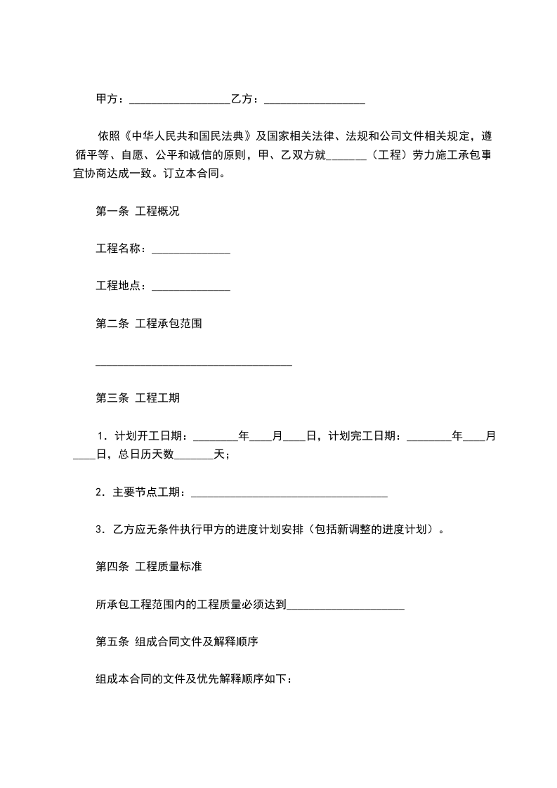 依照《中华人民共和国民法典》及国家相关法律、法规和公司文件相关规定,遵循平等、自愿、公平和诚信的原则,甲、乙双方就_______(工程)劳力施工承包事宜协商达成一致。订立本合同。