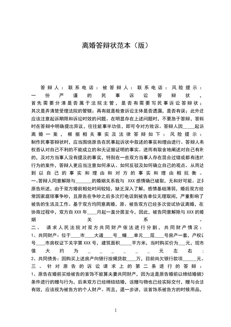 其次是弄清楚受理法院的管辖;再有就是检查诉讼主体是否遗漏,是否有误;此外还应该注意起诉期限和诉讼时效的问题。在明显存在上述问题时,不要急于答辩,答辩时在答辩中明确提出异议,往往能事半功倍,即可令对方败诉。答辩人因_____起诉离婚一案,根据相关事实及法律答辩如下:风险提示: