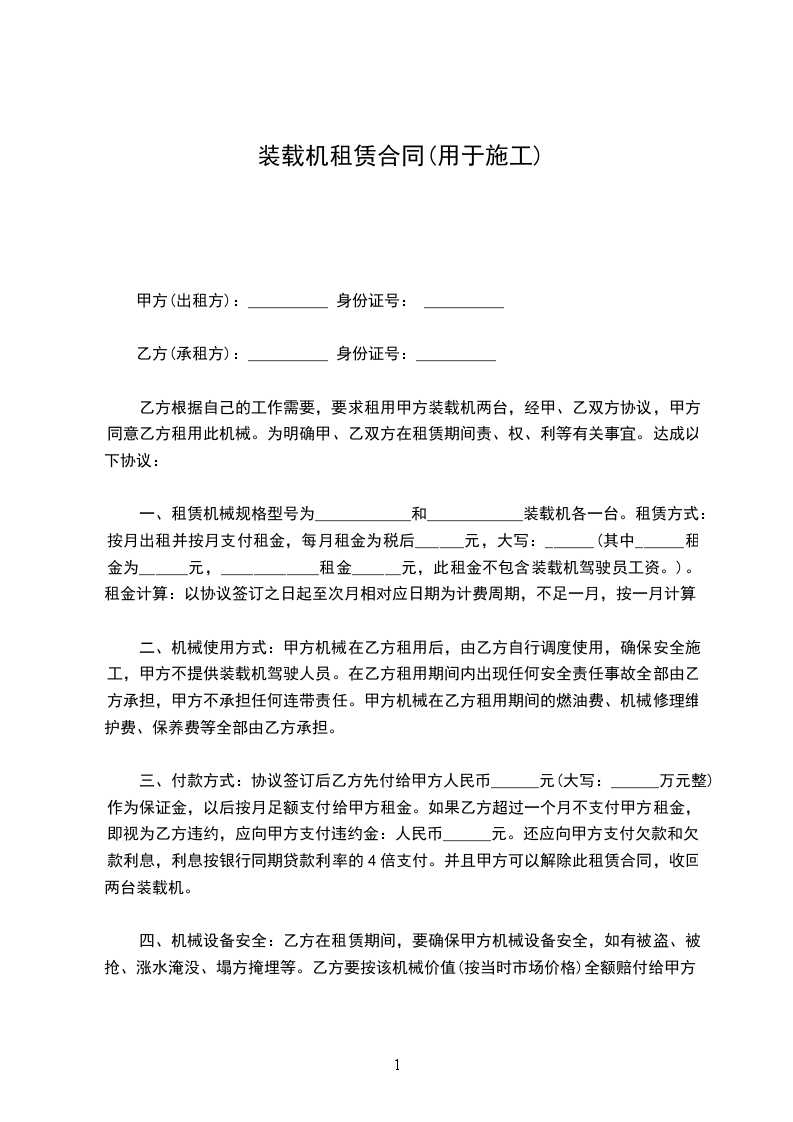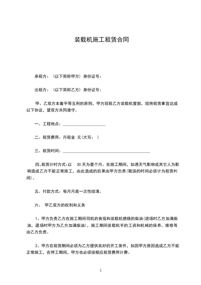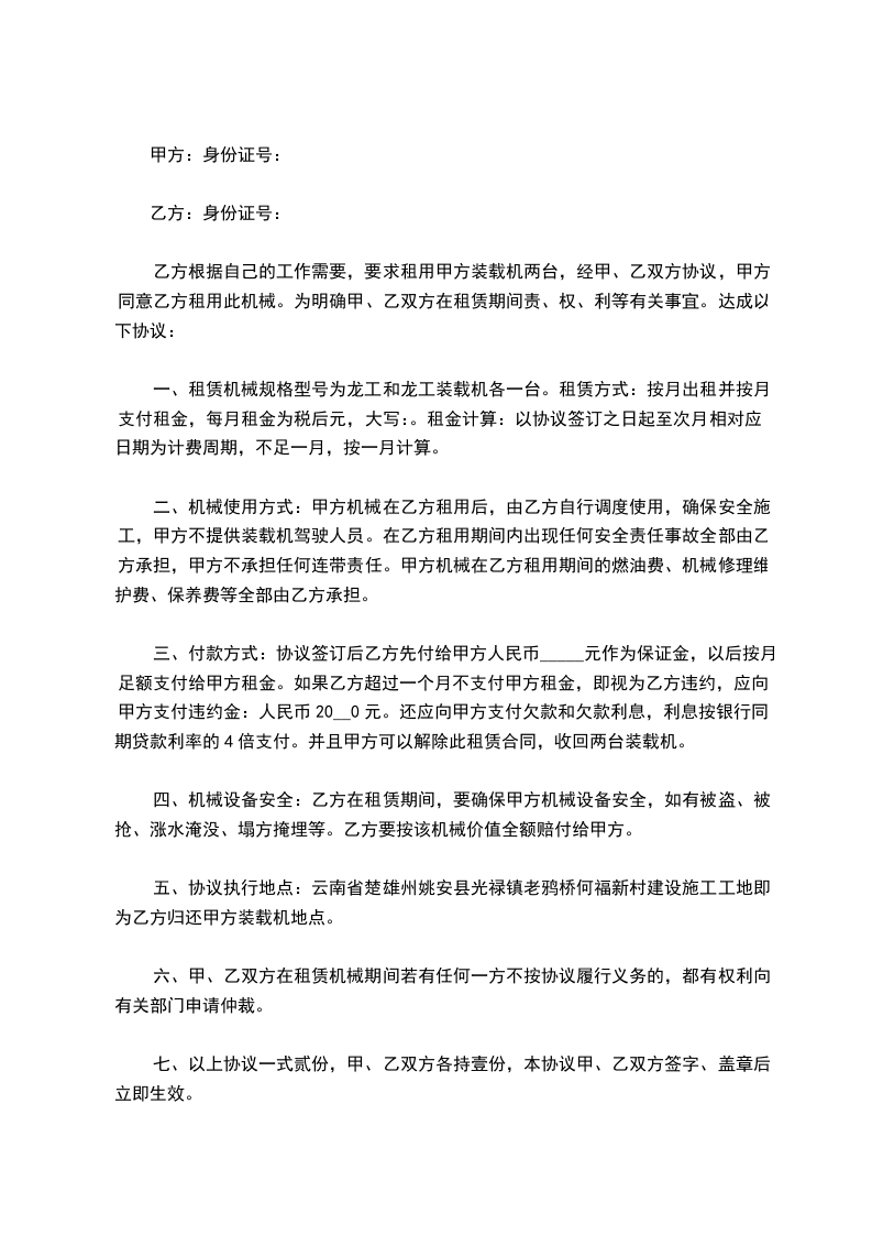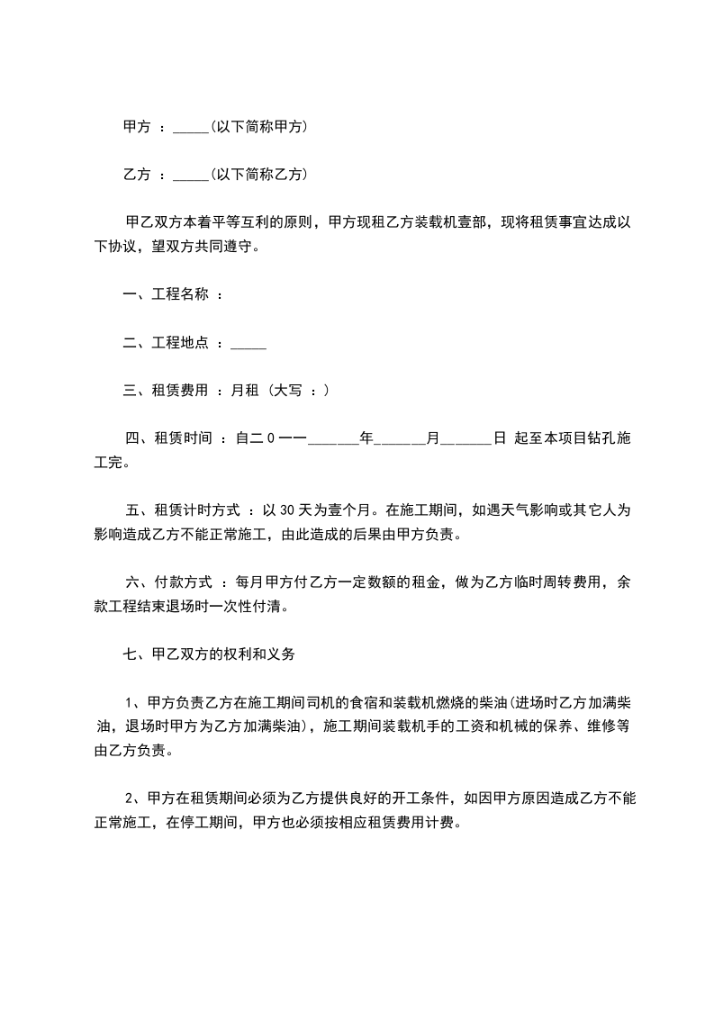 一、经甲、乙双方商定,甲方将装载机租给乙方使用并派出工作人员,装载机连同工作人员的费用为每小时元,装载机的工作用燃油,来回路上用燃油均由甲方负责。