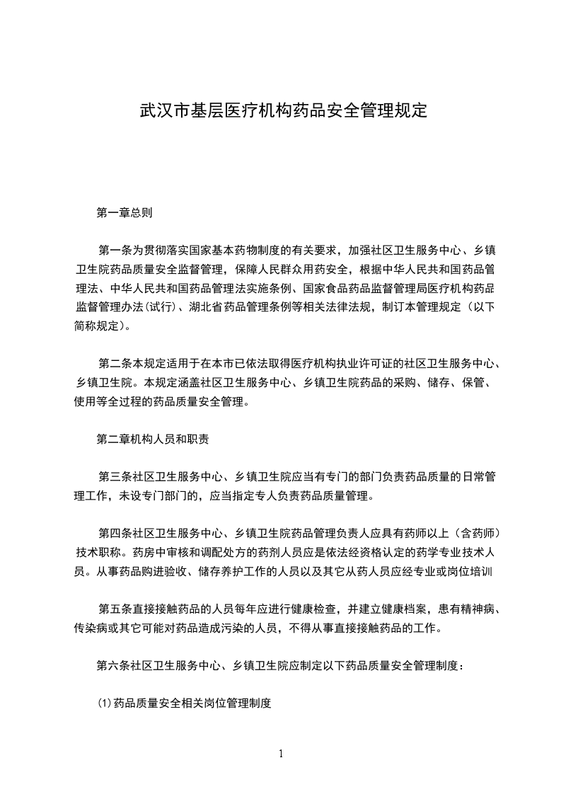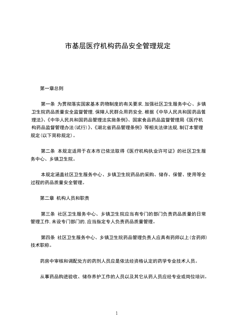 第一条 为贯彻落实国家基本药物制度的有关要求,加强社区卫生服务中心、乡镇卫生院药品质量安全监督管理,保障人民群众用药安全,根据《中华人民共和国药品管理法》、《中华人民共和国药品管理法实施条例》、国家食品药品监督管理局《医疗机构药品监督管理办法(试行)》、《湖北省药品管理条例》等相关法律法规,制订本管理规定(以下简称规定)。