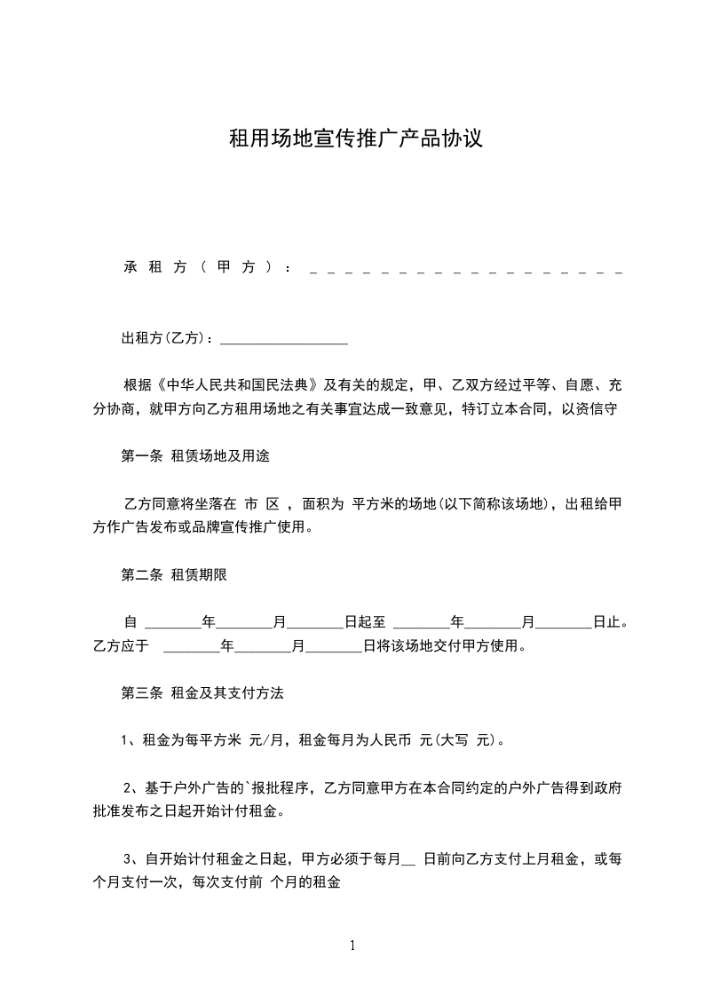 一、甲方向乙方提供的进行广告宣传、产品销售活动的场所为:某号楼大厅的某块位置,具体位置根据乙方使用当天的具体情况由甲方确定,面积为: