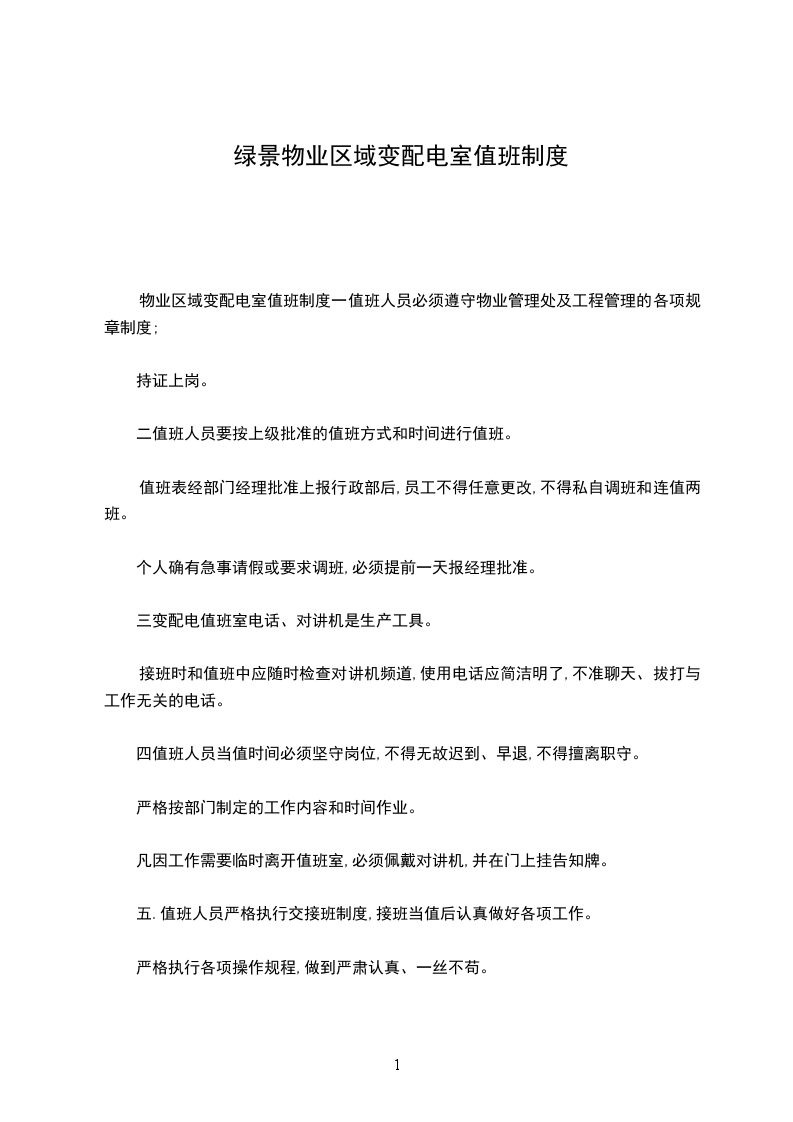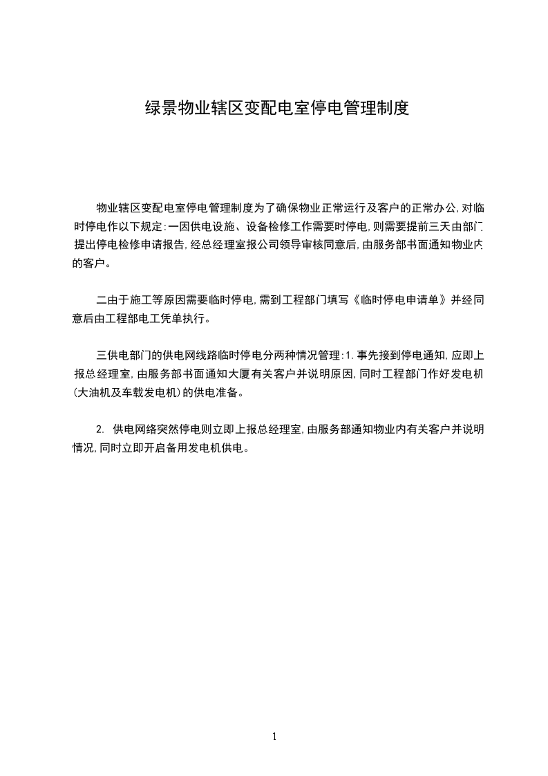 物业辖区变配电室停电管理制度为了确保物业正常运行及客户的正常办公,对临时停电作以下规定:一因供电设施、设备检修工作需要时停电,则需要提前三天由部门提出停电检修申请报告,经总经理室报公司领导审核同意后,由服务部书面通知物业内的客户。