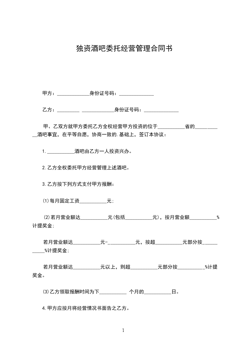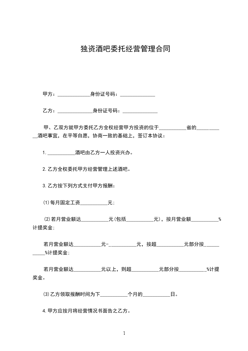 甲、乙双方就甲方委托乙方全权经营甲方投资的位于___________省的___________酒吧事宜,在平等自愿,协商一致的.基础上,签订本协议: