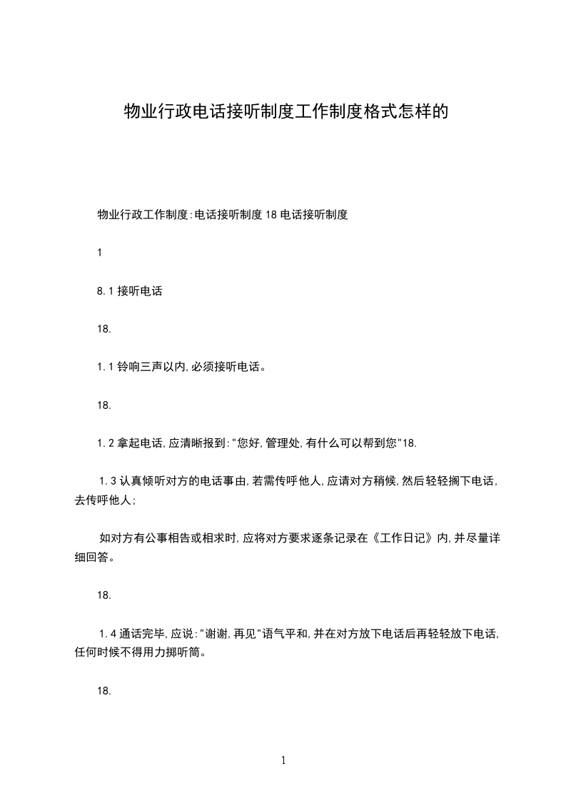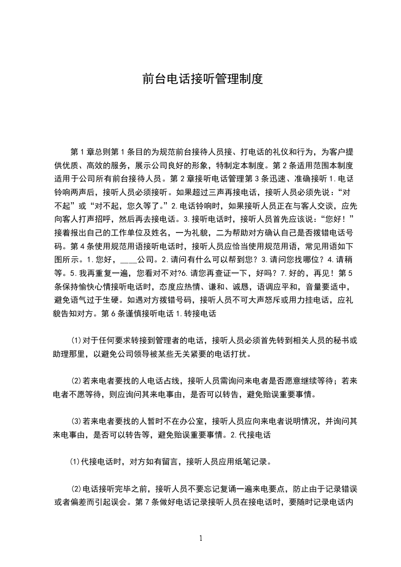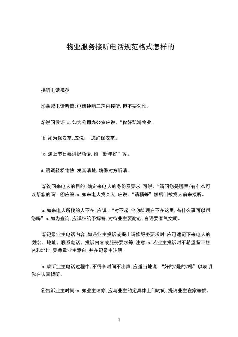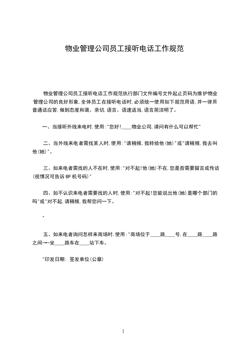物业管理公司员工接听电话工作规范执行部门文件编号文件起止页码为维护物业管理公司的良好形象,全体员工在接听电话时,必须统一使用如下规范用语,并一律用普通话应答,做到态度和蔼、亲切,语言、语速适当,语言简洁明了。