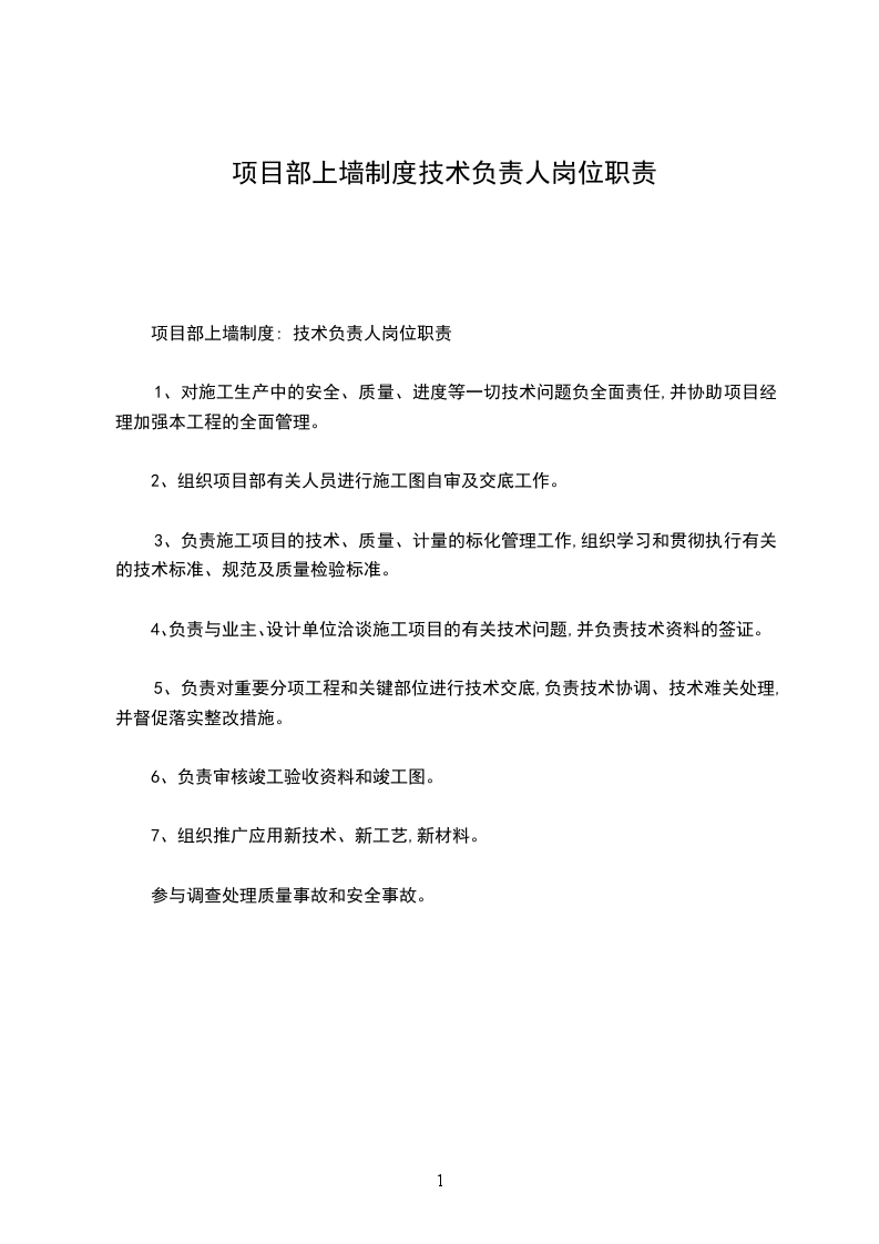 项目部上墙制度: 技术负责人岗位职责
