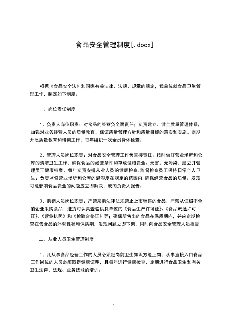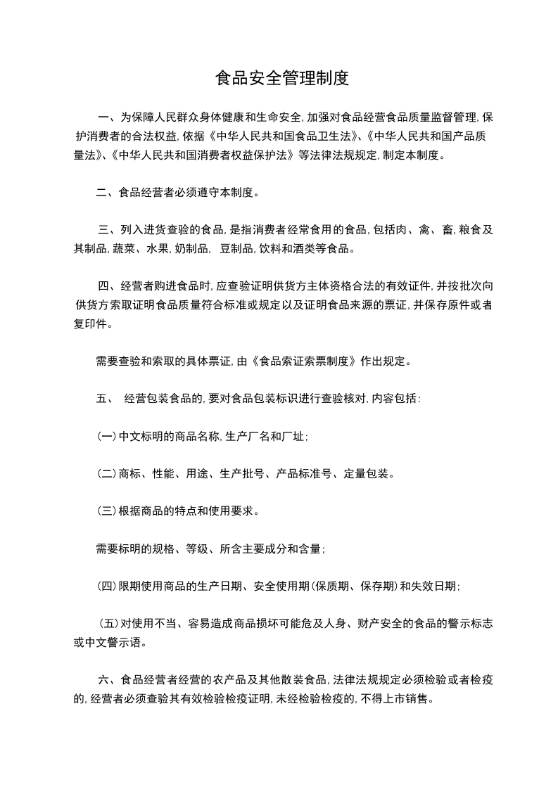 食品安全管理制度食品经营过程从食品采购、运输、验收、贮存、销售各环节以及现场加工食品的场所、设施、人员的基本卫生要求和管理准则。