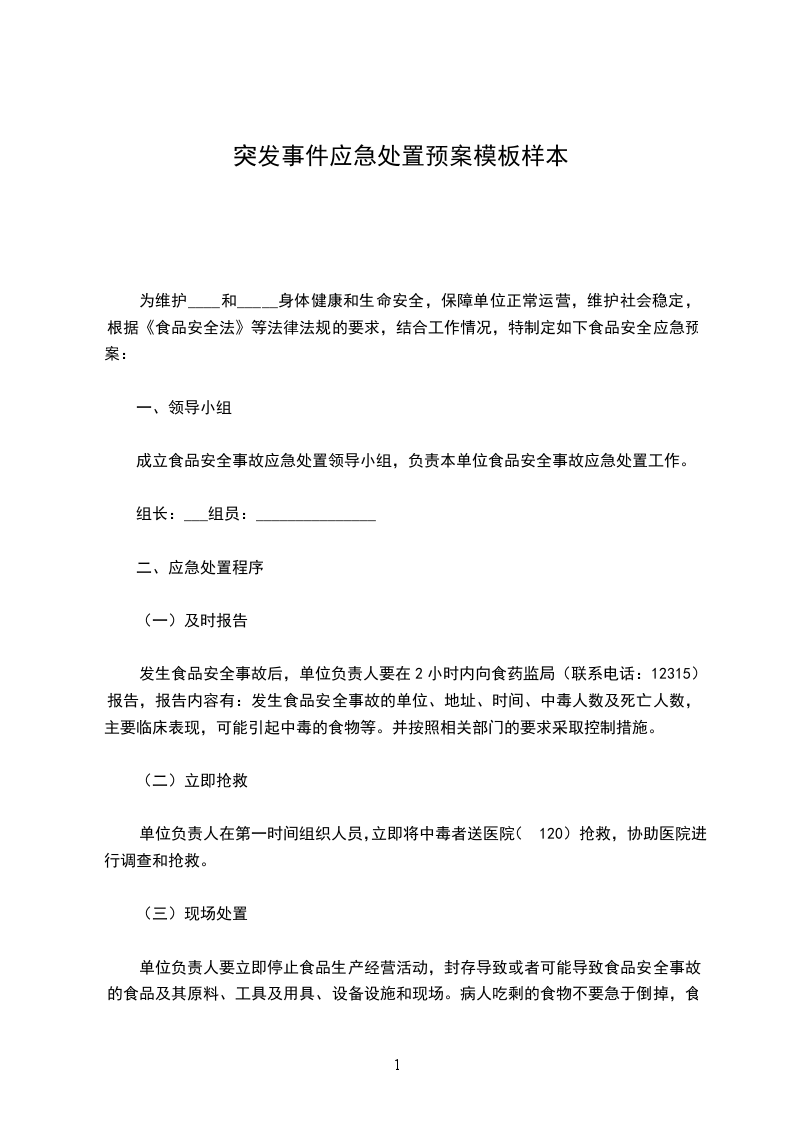 一、本单位主要负责人为食品安全事故报告的第一责任人,设立本单位各部门食品安全专(兼)职管理人员,并负责制定必要的食品安全事故应急预案。