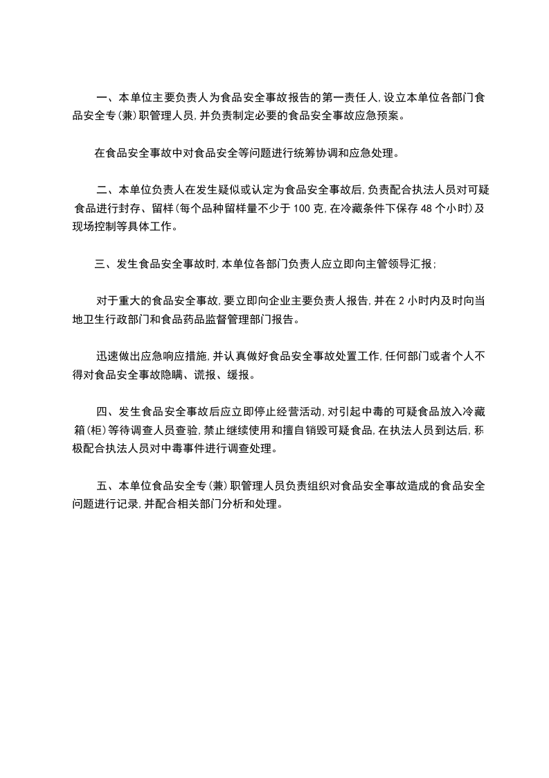 二、本单位负责人在发生疑似或认定为食品安全事故后,负责配合执法人员对可疑食品进行封存、留样(每个品种留样量不少于100克,在冷藏条件下保存48个小时)及现场控制等具体工作。