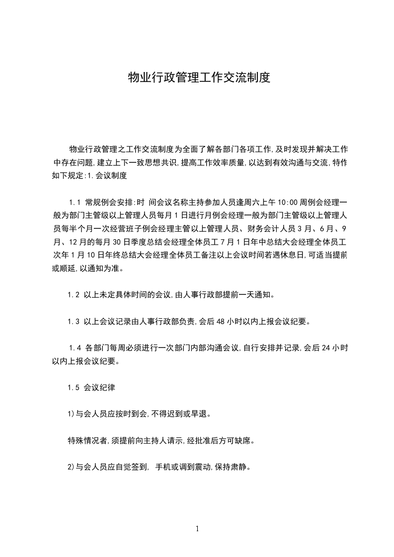 物业行政管理之工作交流制度为全面了解各部门各项工作,及时发现并解决工作中存在问题,建立上下一致思想共识,提高工作效率质量,以达到有效沟通与交流,特作如下规定:1.会议制度