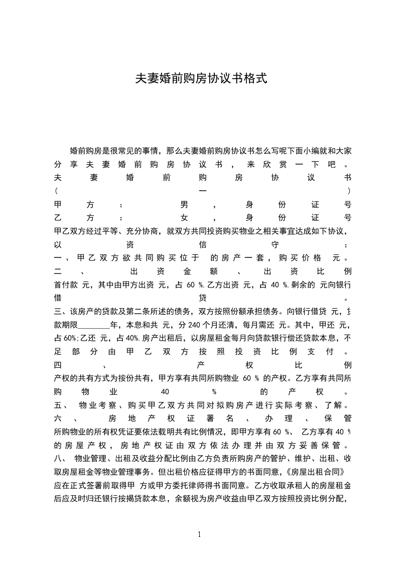 夫妻婚前购房协议书