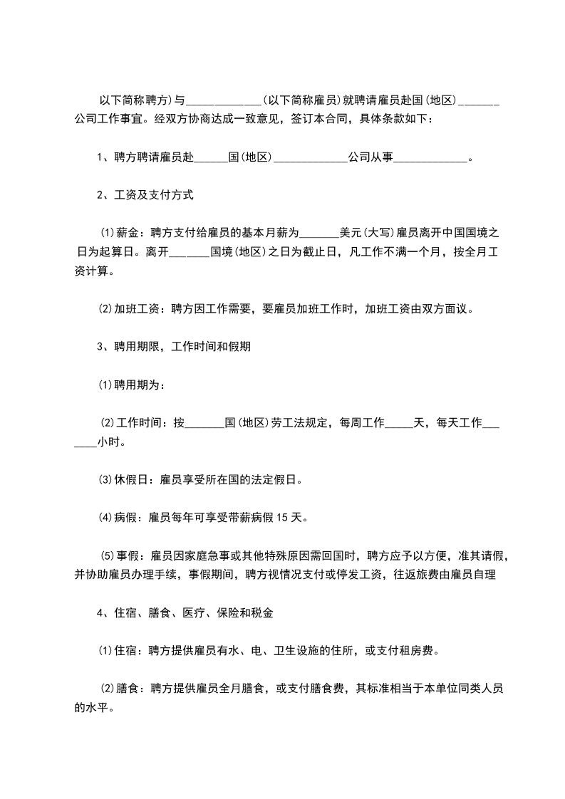 以下简称聘方)与_____________(以下简称雇员)就聘请雇员赴国(地区)_______公司工作事宜。经双方协商达成一致意见,签订本合同,具体条款如下: