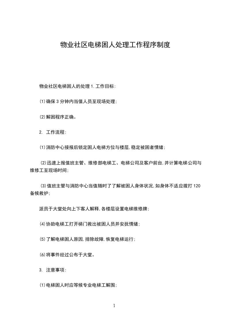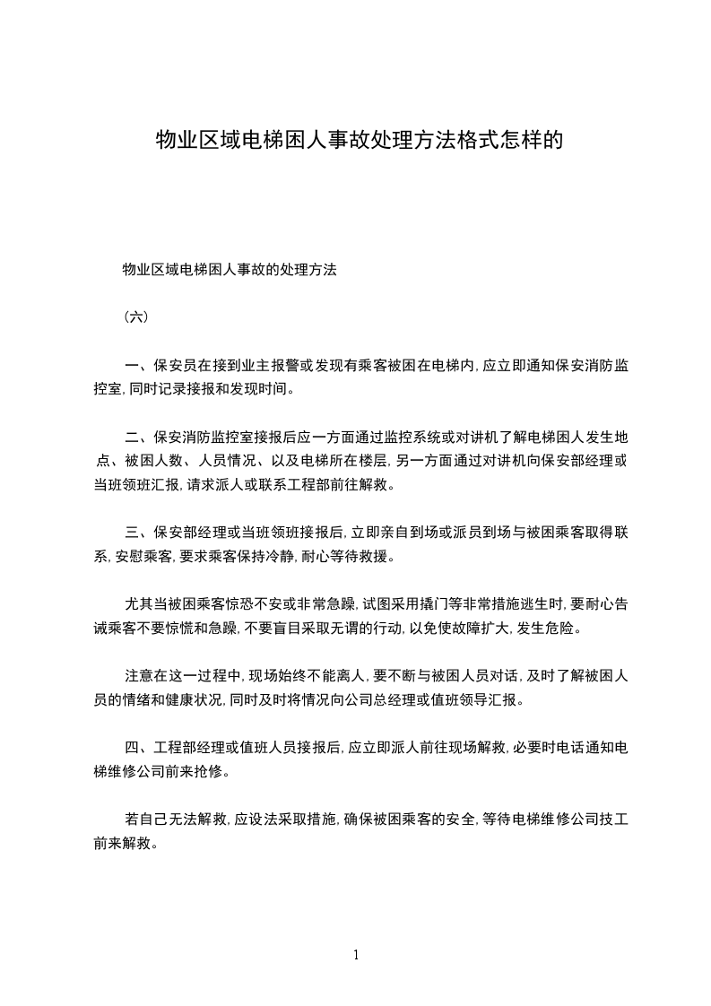 物业辖区电梯困人处理规程1目的为规范电梯困人处理程序,确保及时安全的进行援救,特制定本规程。