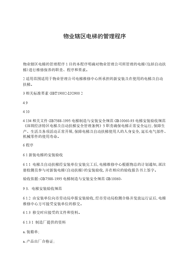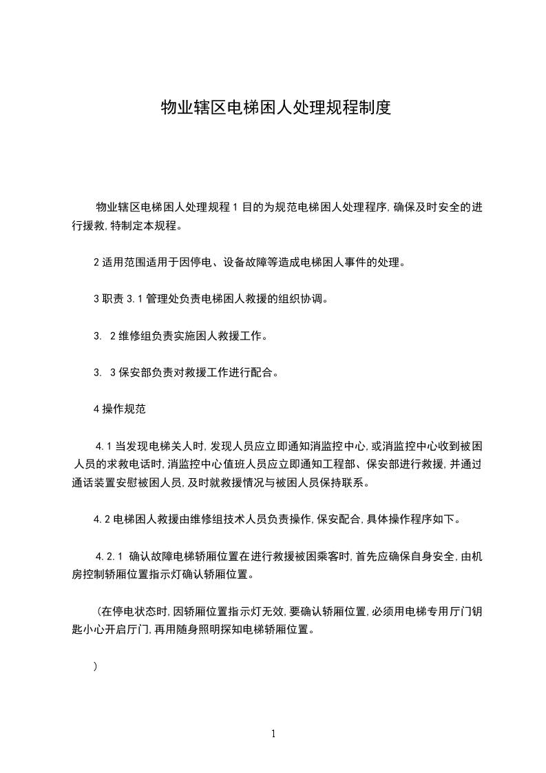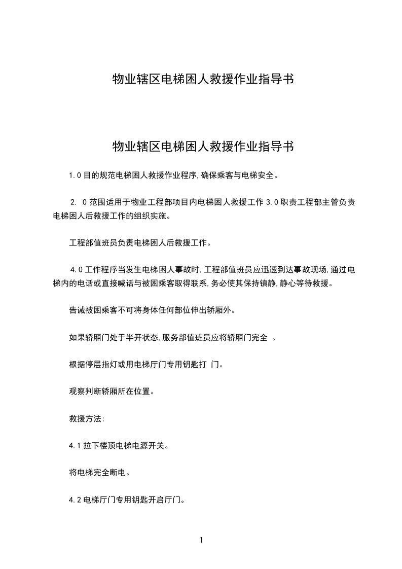 4.2电梯困人救援由维修组技术人员负责操作,保安配合,具体操作程序如下。