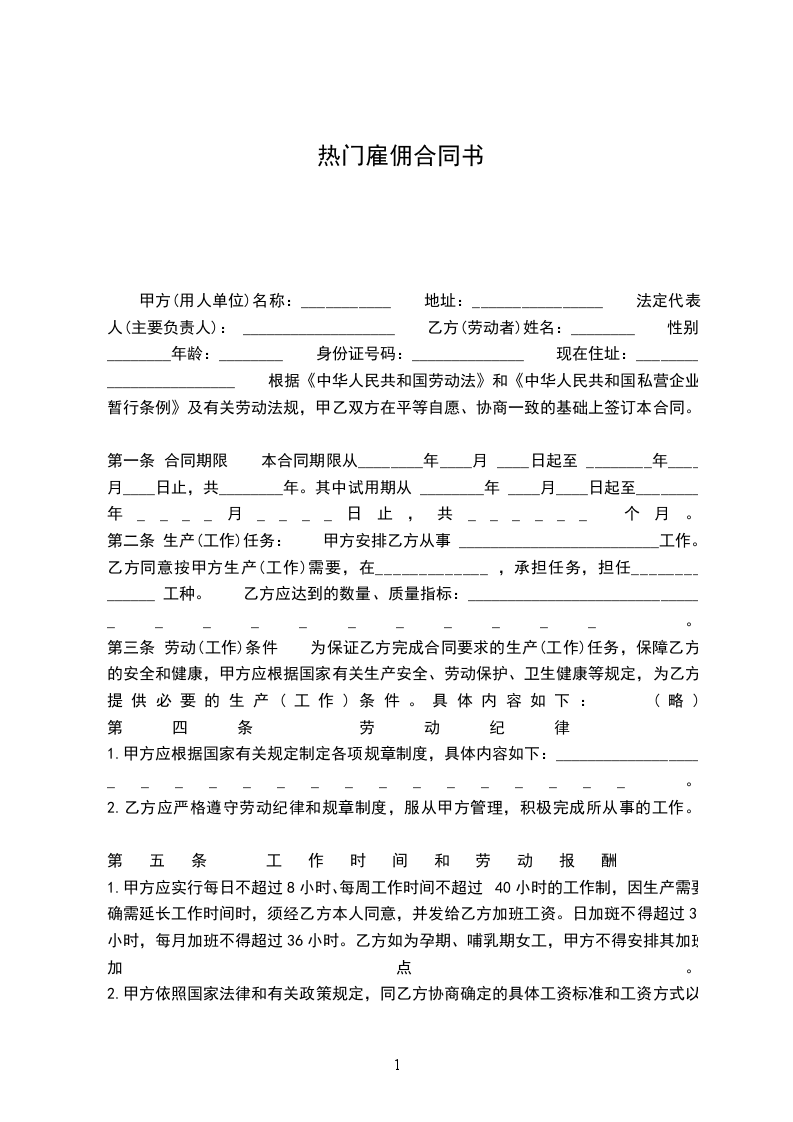 1、本合同于________年____月____日生效,期限为受雇方从事的有关工作和业务全部结束。