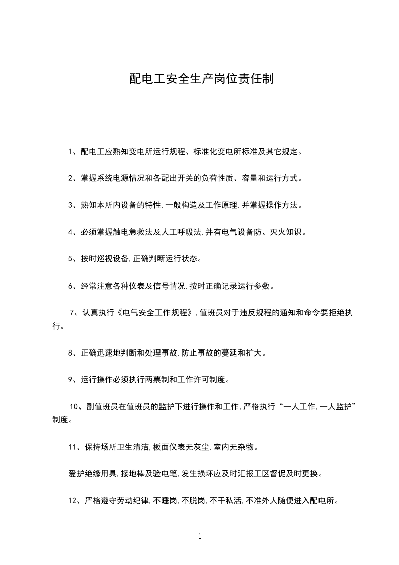 12、严格遵守劳动纪律,不睡岗,不脱岗,不干私活,不准外人随便进入配电所。