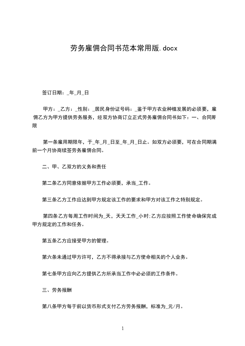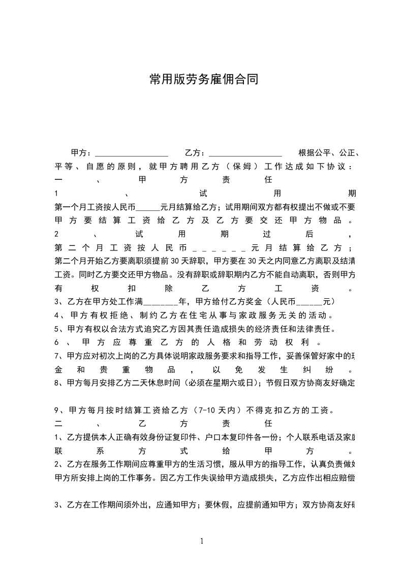 甲方:__________________ 乙方:__________________ 根据公平、公正、平等、自愿的原则,就甲方聘用乙方(保姆)工作达成如下协议: