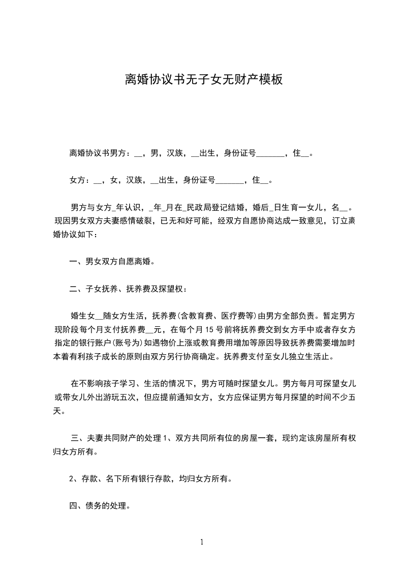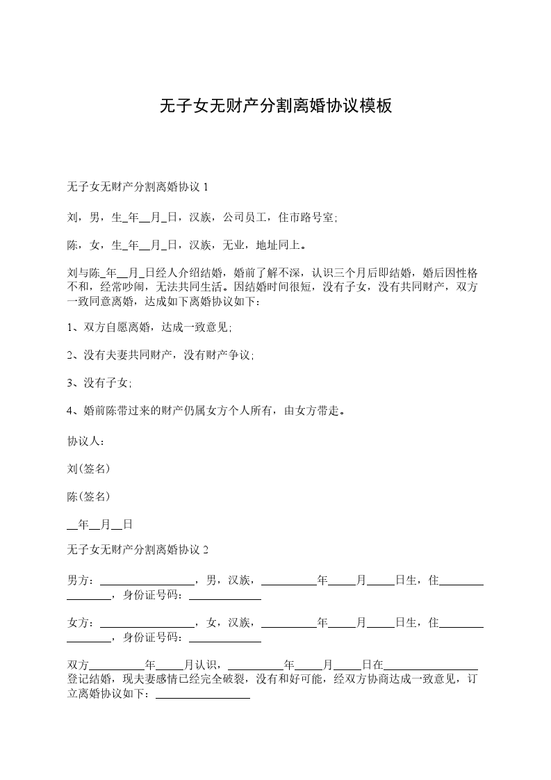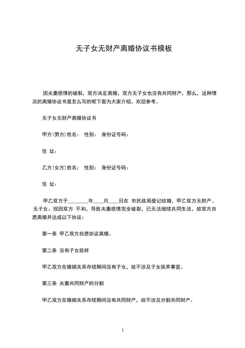 无子女无财产离婚协议书