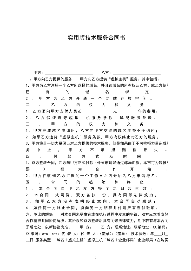 六、争议的解决 对本合同未尽事宜或在执行过程中发生的争议,双方应本着友好合作精神共同协商解决。其协议经双方签署后具有同等法律效力,期中若有与本合同矛盾之处,以新协议为准。 甲 方: 乙 方:联系地址:联系地址:XX编码:XX编码:e-a:e-a:代 表 人:代 表 人:(盖章):(盖章):技术参数:年____月____日 服务类型:“域名+虚拟主机”虚拟主机“域名+企业邮局”企业邮局(在购买的服务项目栏内划钩,未购买的划叉。)绑定域名:规 格:___________型________元________年企业邮箱:___________个(总空间