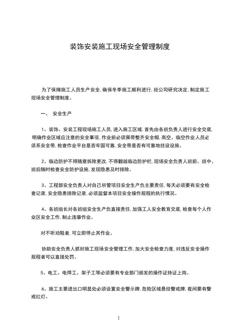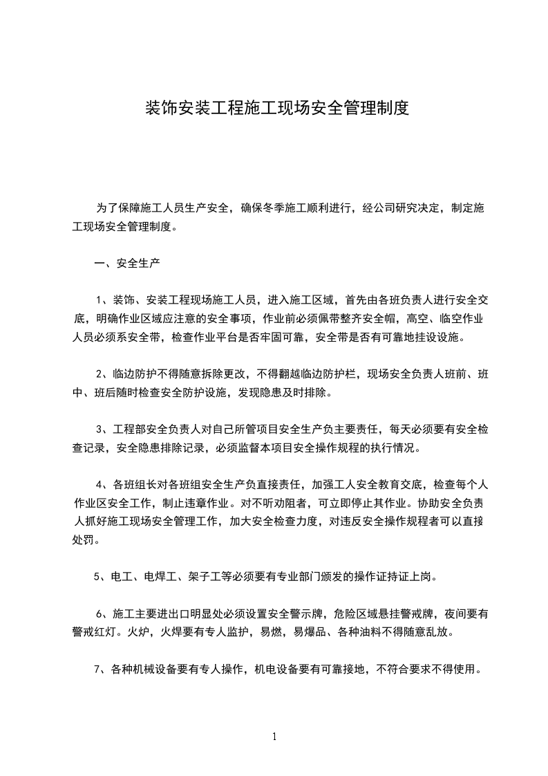 为了保障施工人员生产安全,确保冬季施工顺利进行,经公司研究决定,制定施工现场安全管理制度。