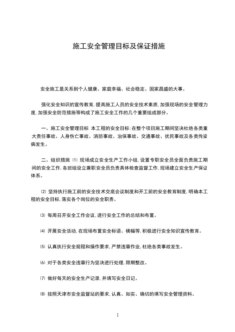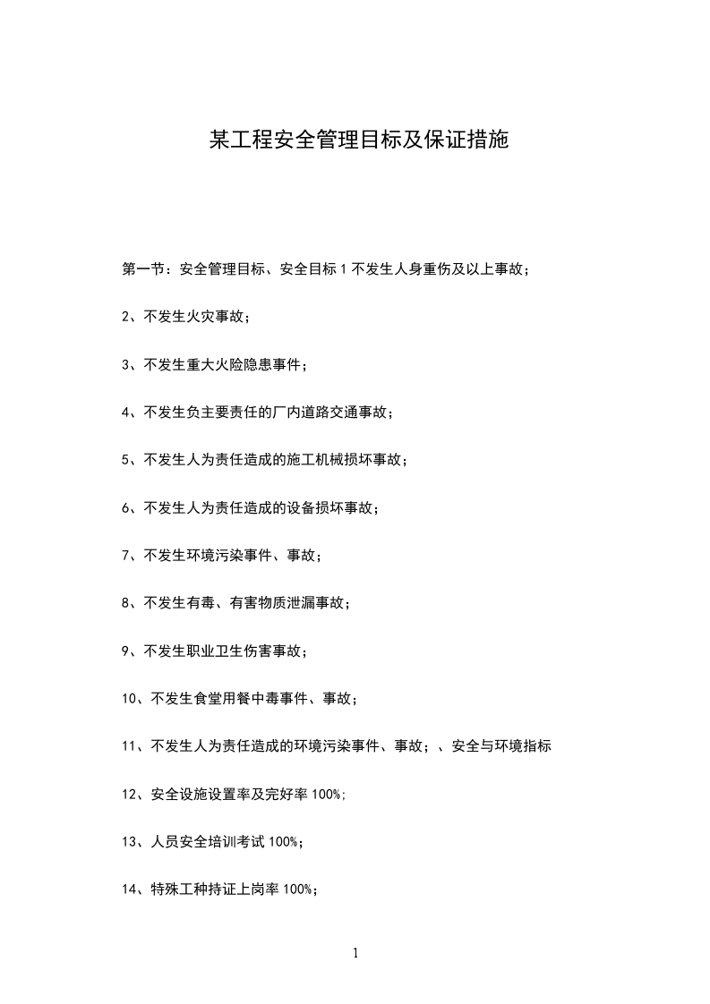 一、施工安全管理目标 本工程的安全目标:在整个项目施工期间坚决杜绝各类重大责任事故、人身伤亡事故、消防事故、治保事故、交通事故、扰民事故及各类传染病发生。