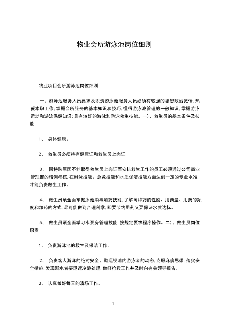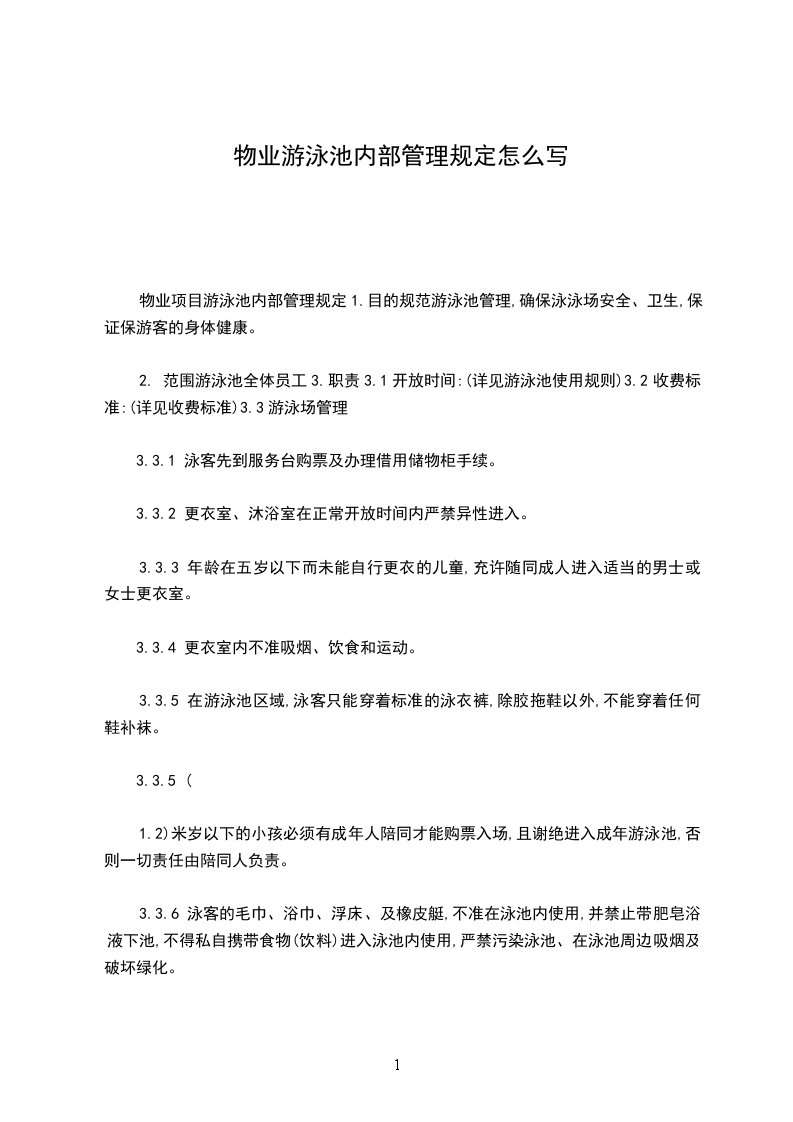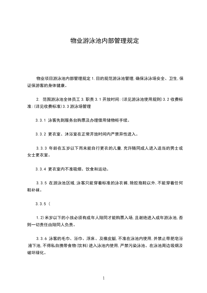 物业项目游泳池内部管理规定1.目的规范游泳池管理,确保泳泳场安全、卫生,保证保游客的身体健康。