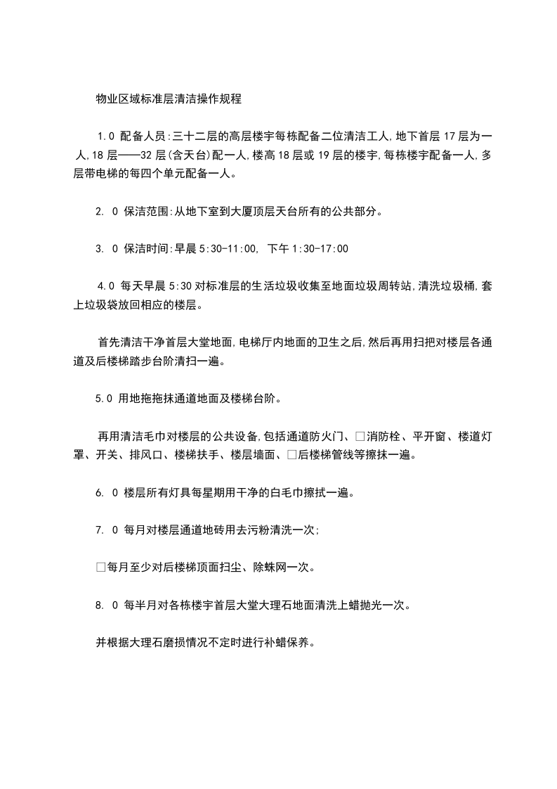 3. 0 保洁时间:早晨5:30-11:00, 下午1:30-17:00