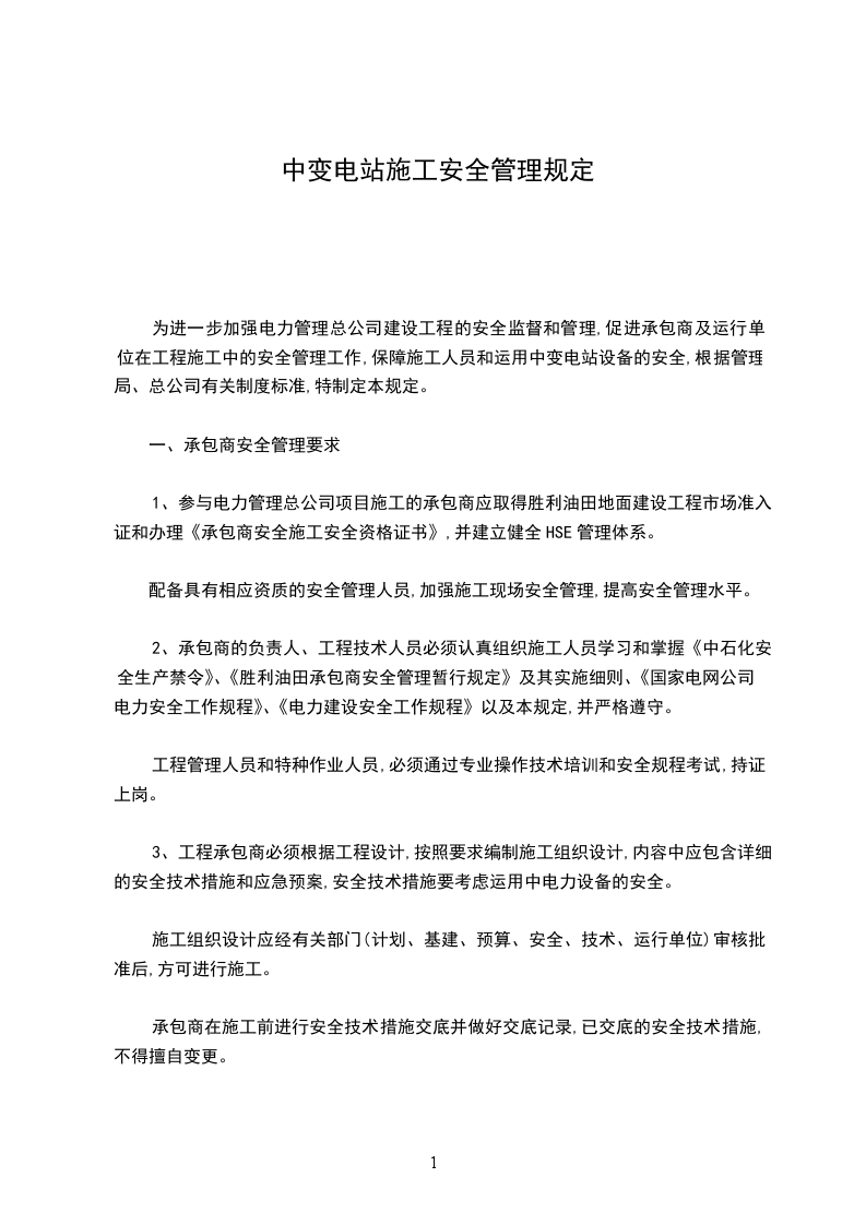 为进一步加强电力管理总公司建设工程的安全监督和管理,促进承包商及运行单位在工程施工中的安全管理工作,保障施工人员和运用中变电站设备的安全,根据管理局、总公司有关制度标准,特制定本规定。