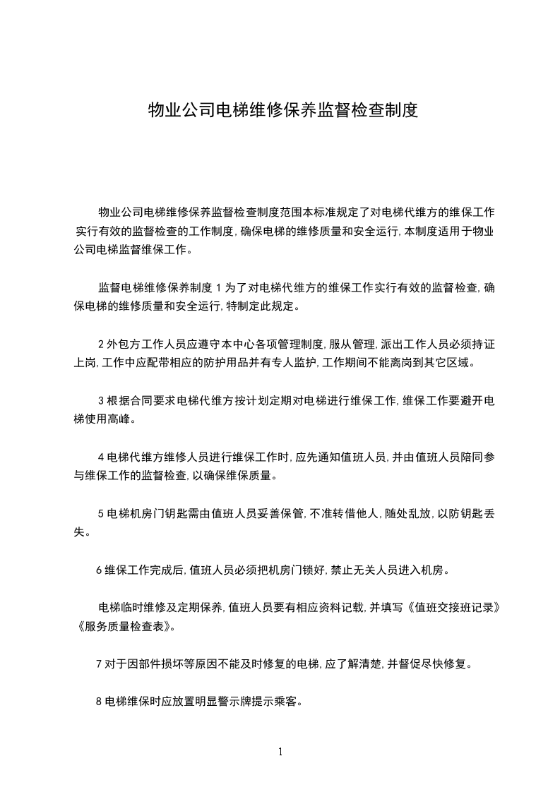 物业公司电梯维修保养监督检查制度范围本标准规定了对电梯代维方的维保工作实行有效的监督检查的工作制度,确保电梯的维修质量和安全运行,本制度适用于物业公司电梯监督维保工作。