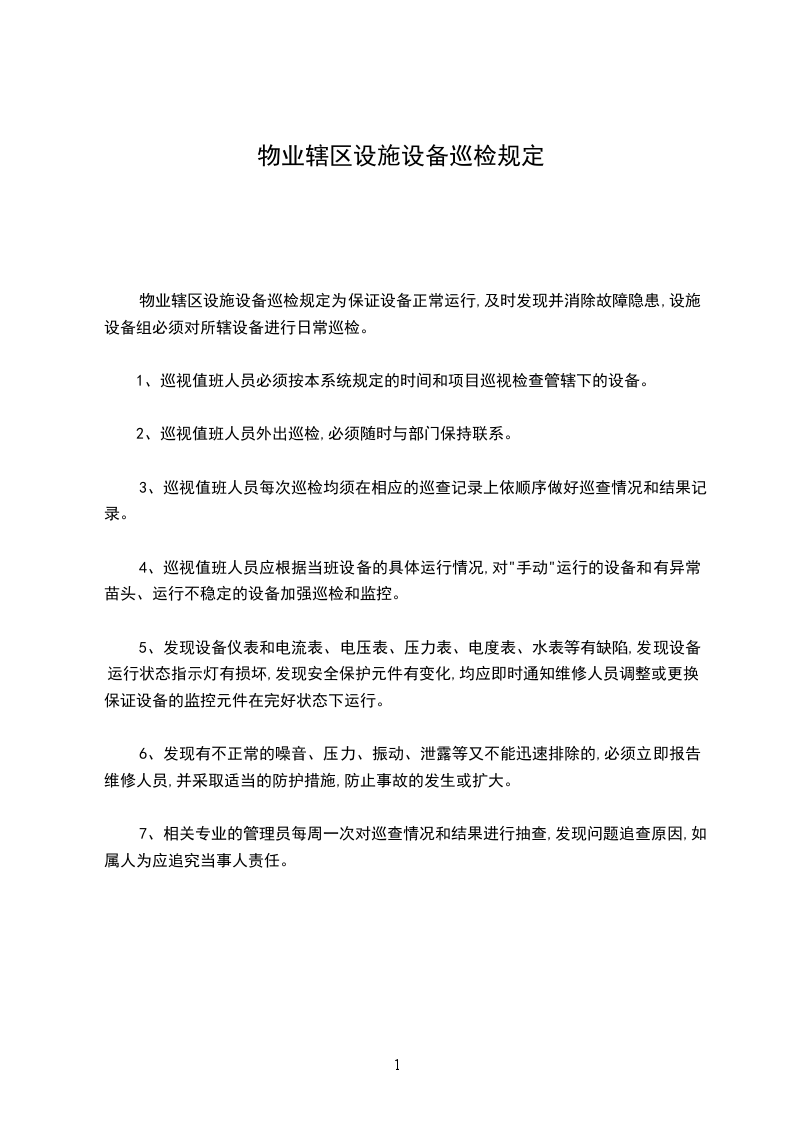 物业辖区设施设备巡检规定为保证设备正常运行,及时发现并消除故障隐患,设施设备组必须对所辖设备进行日常巡检。