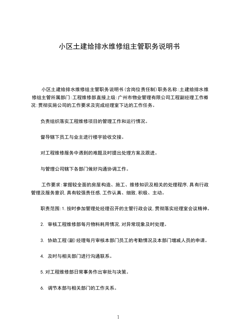 小区土建给排水维修组主管职务说明书(含岗位责任制)职务名称:土建给排水维修组主管所属部门:工程维修部直接上级:广州市物业管理有限公司工程副经理工作概况:贯彻实施公司的工作要求及完成经理室下达的工作任务。