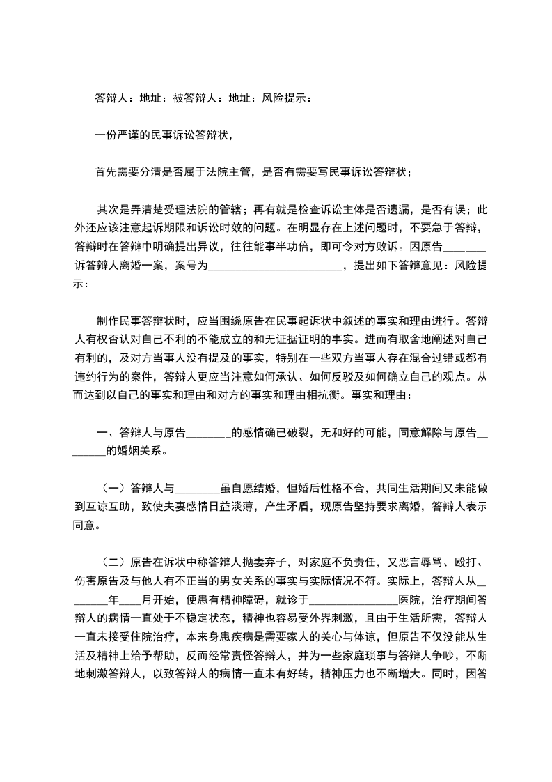 其次是弄清楚受理法院的管辖;再有就是检查诉讼主体是否遗漏,是否有误;此外还应该注意起诉期限和诉讼时效的问题。在明显存在上述问题时,不要急于答辩,答辩时在答辩中明确提出异议,往往能事半功倍,即可令对方败诉。因原告________诉答辩人离婚一案,案号为________________________,提出如下答辩意见:风险提示: