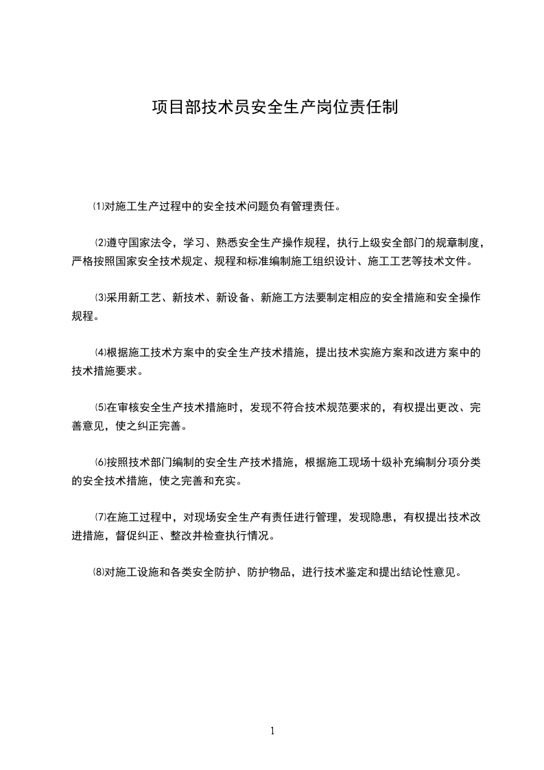 3项目部总工程师安全职责⑴组织有关人员认真学习和贯彻执行安全生产和安全技术管理规定,对本项目工程生产经营中的技术工作负安全责任。