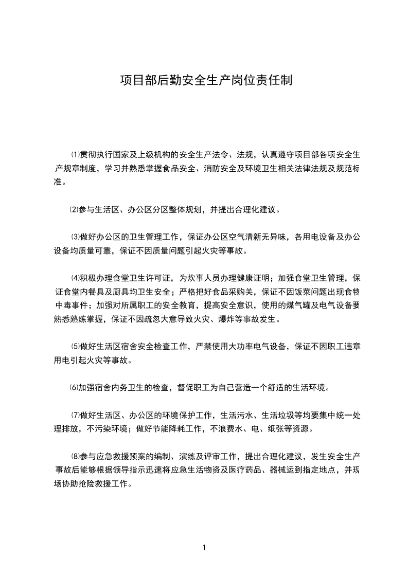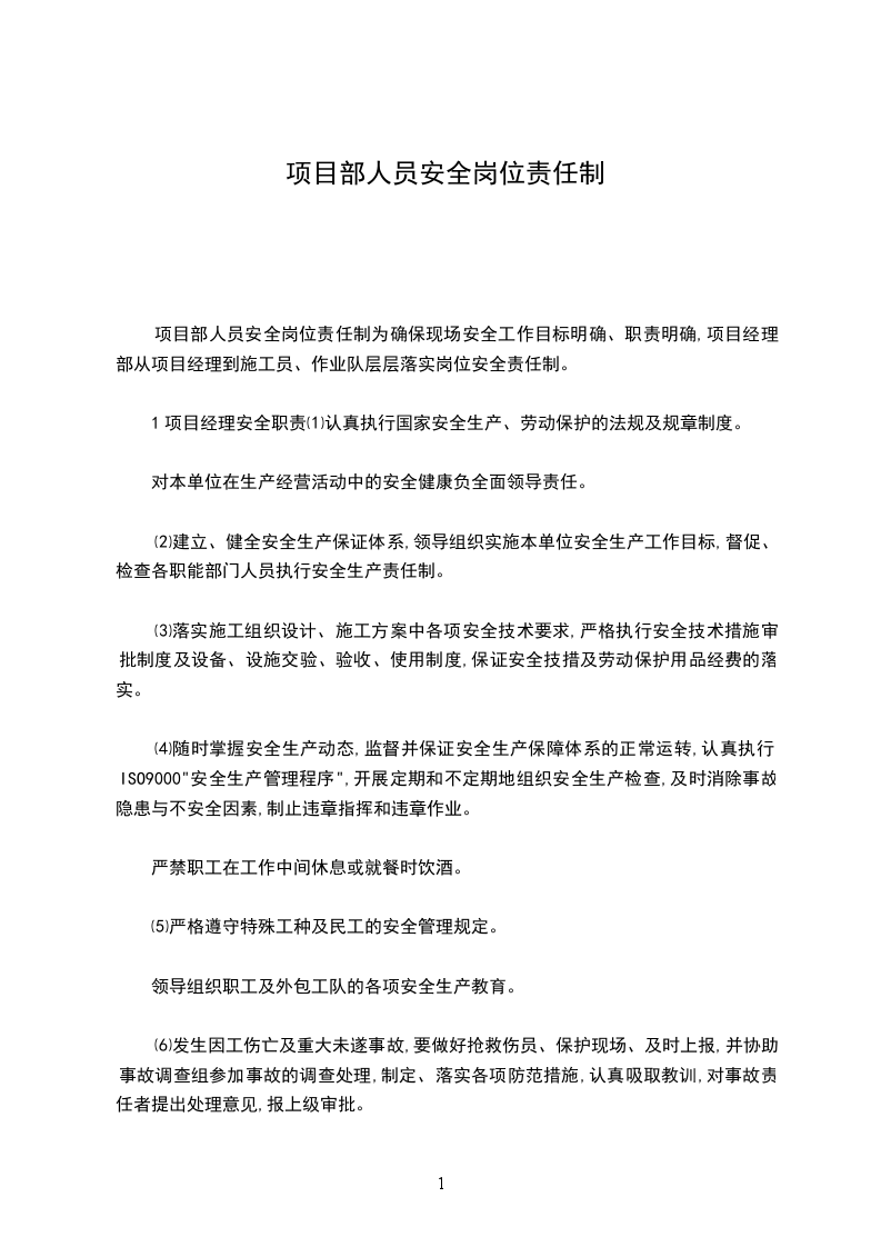 项目部人员安全岗位责任制为确保现场安全工作目标明确、职责明确,项目经理部从项目经理到施工员、作业队层层落实岗位安全责任制。