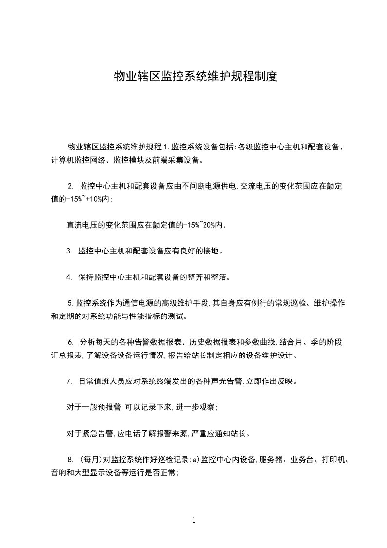 物业辖区监控系统维护规程1.监控系统设备包括:各级监控中心主机和配套设备、计算机监控网络、监控模块及前端采集设备。