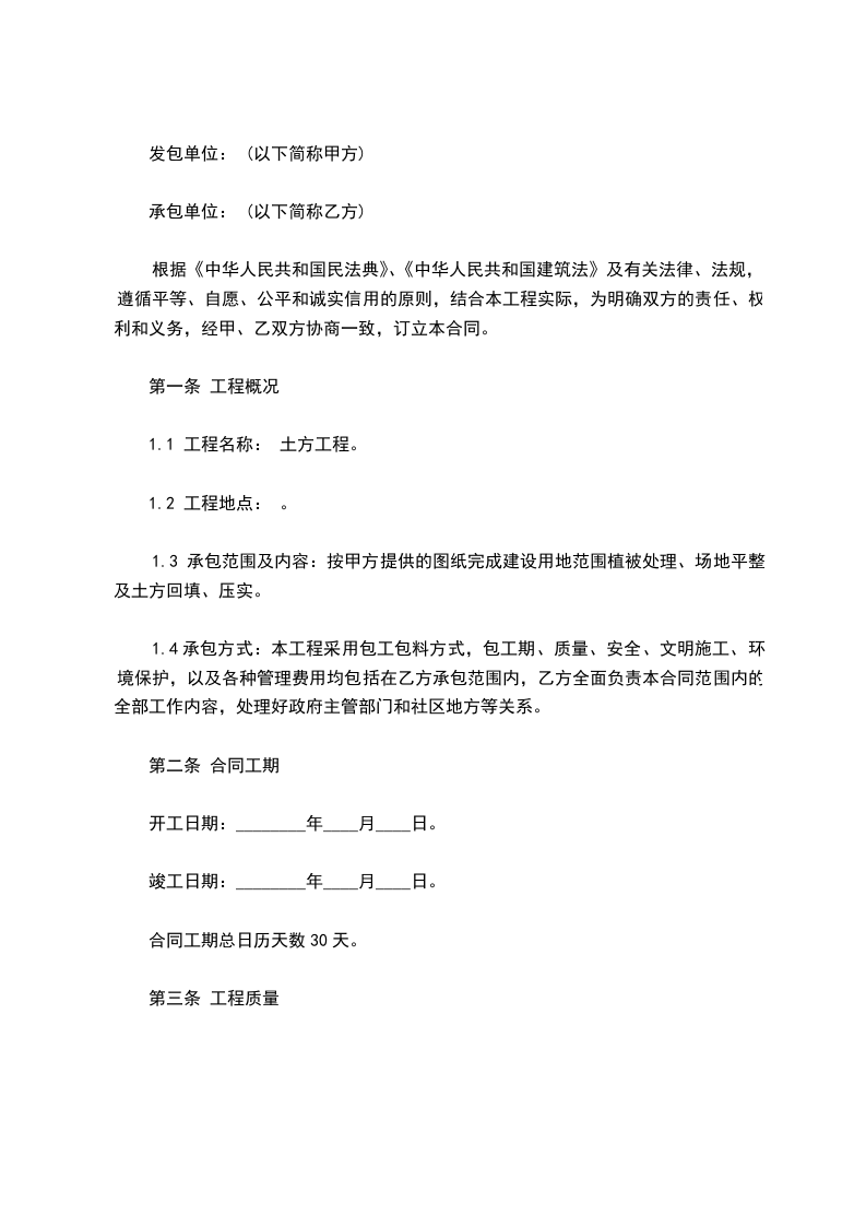 3.1 乙方必须严格按甲方认可的本工程土方回填图纸等工程文件中规定的质量标准组织施工,施工质量应符合现行国家相关质量验收规范、标准要求,工程质量等级为合格。