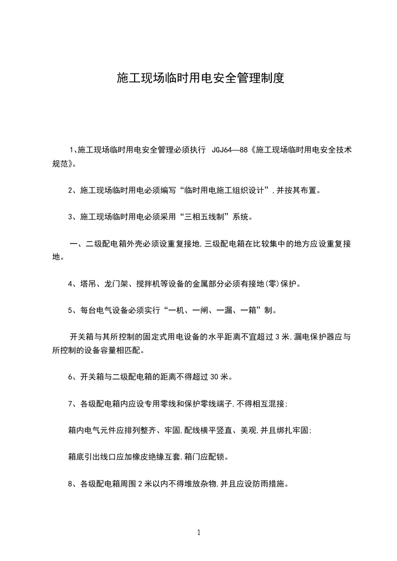 1、施工现场临时用电安全管理必须执行JGJ64—88《施工现场临时用电安全技术规范》。