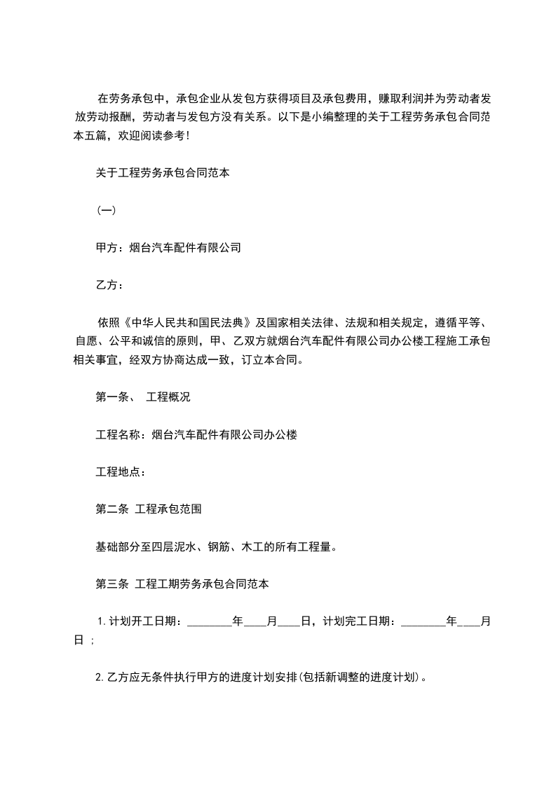 在劳务承包中,承包企业从发包方获得项目及承包费用,赚取利润并为劳动者发放劳动报酬,劳动者与发包方没有关系。以下是小编整理的关于工程劳务承包合同范本五篇,欢迎阅读参考!