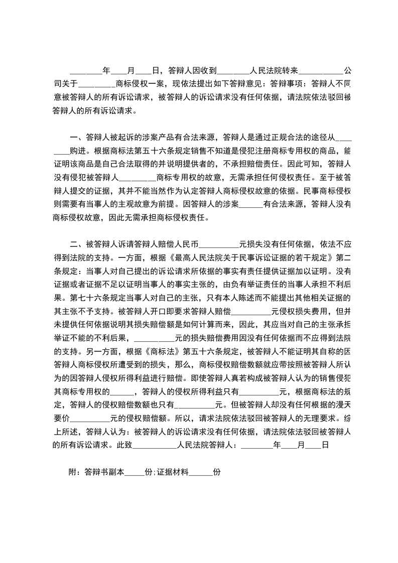 一、答辩人被起诉的涉案产品有合法来源,答辩人是通过正规合法的途径从________购进。根据商标法第五十六条规定销售不知道是侵犯注册商标专用权的商品,能证明该商品是自己合法取得的并说明提供者的,不承担赔偿责任。因此可知,答辩人没有侵犯被答辩人_________商标专用权的故意,无需承担任何侵权责任。至于被答辩人提交的证据,其并不能当然作为认定答辩人商标侵权故意的依据。民事商标侵权则需要有当事人的主观故意为前提。因答辩人的涉案______有合法来源,答辩人没有商标侵权故意,因此无需承担商标侵权责任。