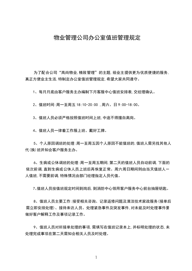 为了配合公司“高尚物业,精致管理”的主题,给业主提供更为优质便捷的服务,真正方便业主生活,特制定办公室值班管理规定,希望大家共同遵守。