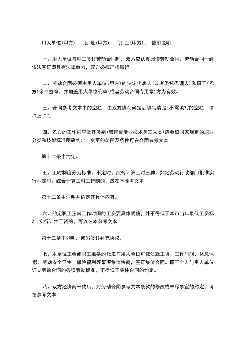 用人单位(甲方): 地 址(甲方): 职 工(甲方): 使用说明