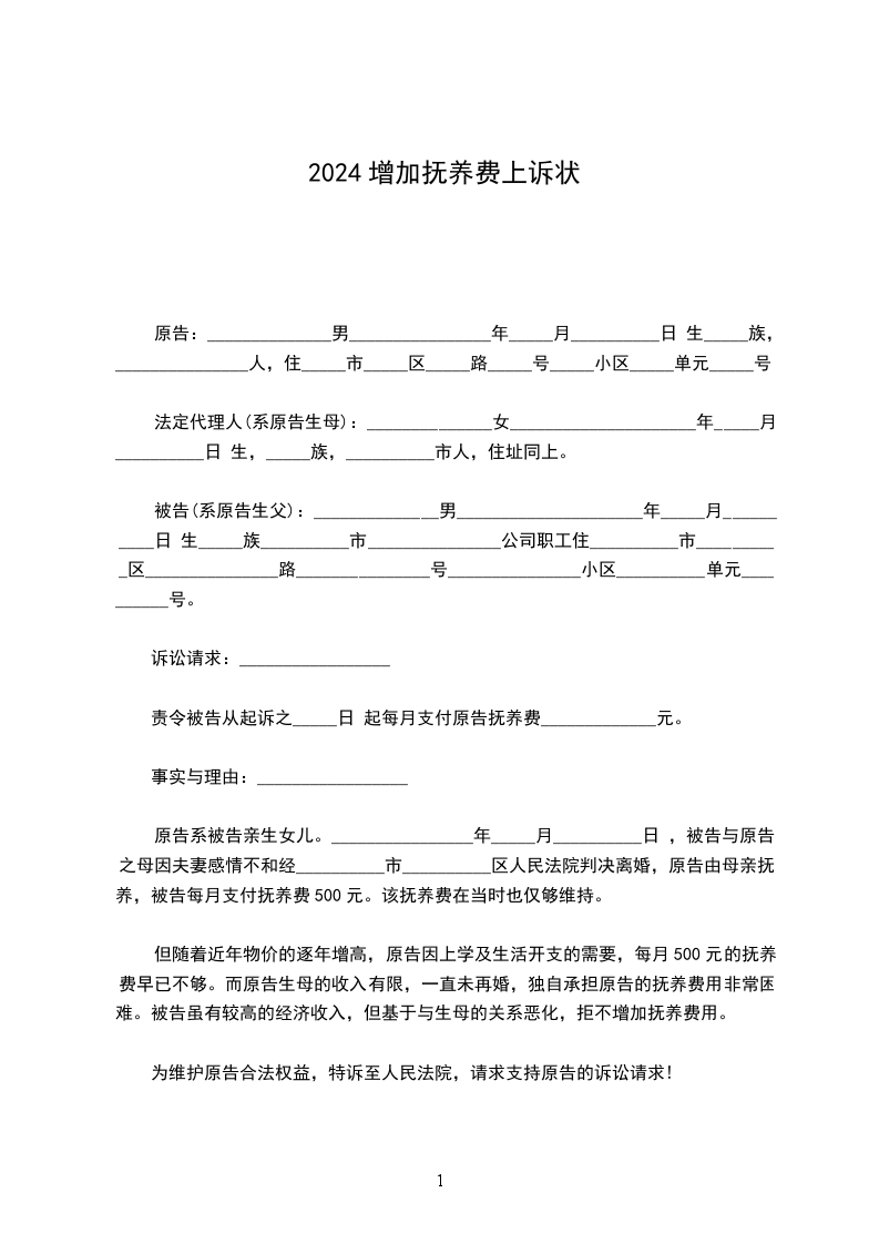被告______系原告亲生____(父亲母亲)。________年____月,被告与原告法定代理人经________法院判决离婚。离婚时,法院判决原告由法定代理人_____抚养,被告每月承担抚养费___元。现在由于物价上涨,原告上学、生活花费较大,被告每月支付的___元抚养费已不够原告花用。现在原告法定代理人收入较少,不能完全承担原告的生活费用。被告系原告亲生____(父亲母亲),抚养原告是其法定责任。为了保护原告的合法权益,使原告的生活有保障,根据《中华人民共和国民事诉讼法》第108条规定,特向法院起诉,请求法院依法判令被告每月给原告增加抚养费由原来的___元增加到___元。