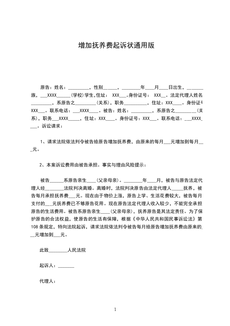 原告:姓名:_________,性别______,________年____月____日出生,_______族,___XXXX______(学校)学生,住址:XXX___。身份证号:XXX__。法定代理人姓名:_________,系原告之_________(关系),职务__________,住址:XXX____。身份证号:XXX___。联系电话:___XXXX____。被告:姓名:_________,系原告之_________(关系),职务___XXXX_____,住址:XXX____。身份证号:XXX___。联系电话:___XXXX____。诉讼请求: